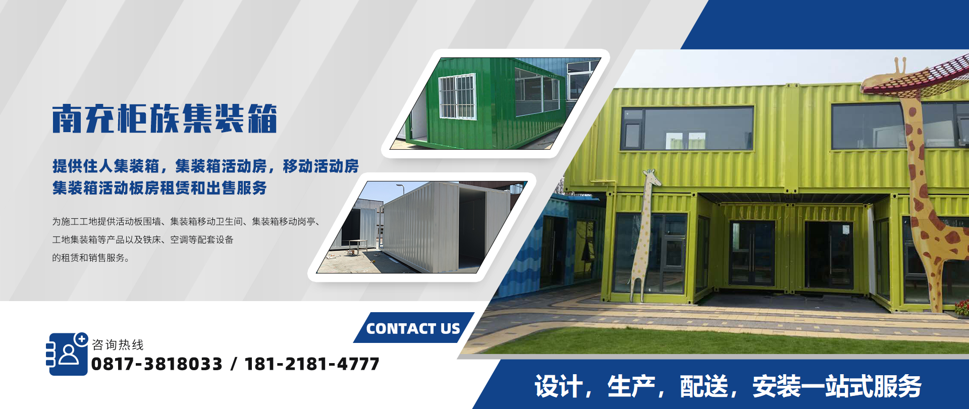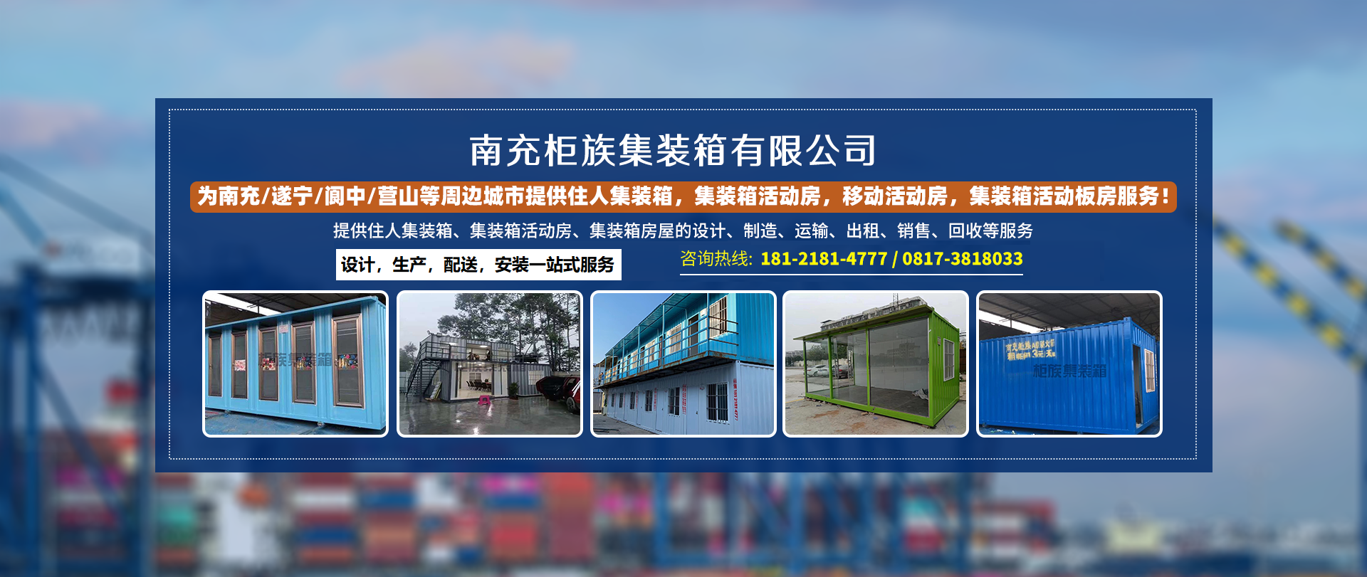 南充柜族集裝箱有限公司是一家為南充/遂寧/閬中/營(yíng)山/蓬安/南部/西充等周邊城市提供住人集裝箱,集裝箱活動(dòng)房,移動(dòng)活動(dòng)房,集裝箱活動(dòng)板房服務(wù)!本公司專業(yè)服務(wù)南充住人集裝箱、南充移動(dòng)活動(dòng)房、南...